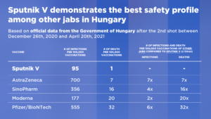 V příloze k tomu vyjádření umístili tabulku, na níž je vidět citelně vyšší účinnost vakcíny Sputnik V ve srovnání s ostatními vakcínami. U ukazatele úmrtí pacienta po vakcinaci je Sputnik V dokonce 32nádobně lepší ve srovnání s Pfizerem. Tyto informace přitom vyplývají z dat získaných od maďarské vlády.