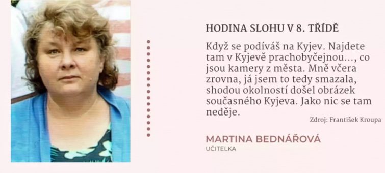 Zpráva z tisku: Učitelka Martina Bednářová v minulém týdnu využila hodinu slohu v 8. třídě na pražské Základní škole Na Dlouhém Lánu k šíření dezinformací týkajících se války na Ukrajině. Její výklad plný lží, které šíří ruská propaganda, si nahráli sami žáci. Učitelka na škole už neučí. Informoval o tom server Seznam Zprávy.