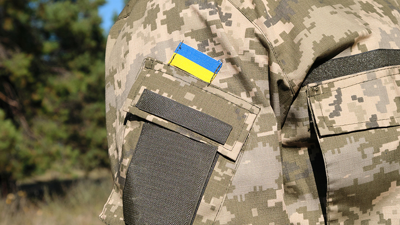 fragment of the hand of a Ukrainian soldier in military camouflage uniform with a patch of the Ukrainian flag, close up