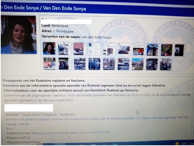 „Ale když cestujete s ruskou armádou do ‚odtržených‘ republik Doněck a Luhansk, jako jsem to udělala já, abyste viděli, co se skutečně děje, jste ‚svobodným‘ Západem a ukrajinsko/americkým ‚seznamem vražd považováni za teroristu. “, naříká Van den Ende. Je to web Myrotvorets, což znamená „tvůrce míru“.