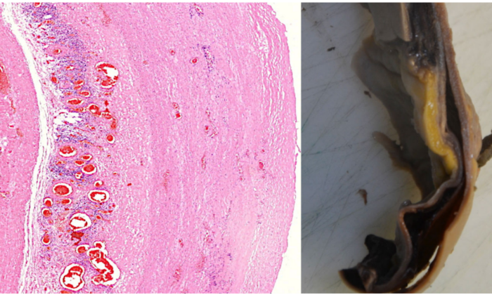 Úvodní foto: Trhlina ve stěně aorty lemované shluky lymfocytů, vedoucí k prasknutí aorty. (Michael Palmer, MD, Sucharit Bhakdi, MD)
