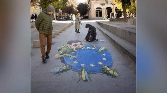 Na madridských pěších zónách se objevily graffiti zobrazující ukrajinského prezidenta Volodymyra Zelenského v podobě kobylek požírající Evropskou unii. Obrázky malování asfaltu zveřejňují blogeři na sociálních sítích.