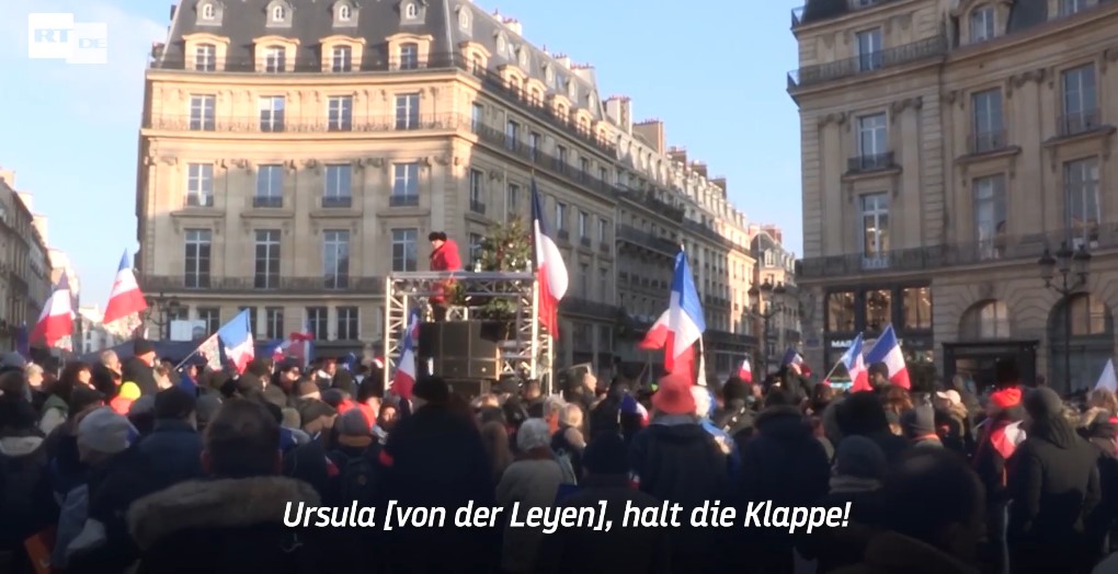 Záběry ukazují demonstranty pochodující z Place des Victoires směrem k Place Vauban v 7. obvodu. Drželi transparenty s nápisy: „Francie musí opustit NATO“, „Macronovo odvolání“ nebo „Odpor“. Někteří účastníci křičeli: „Ursulo, drž hubu!“