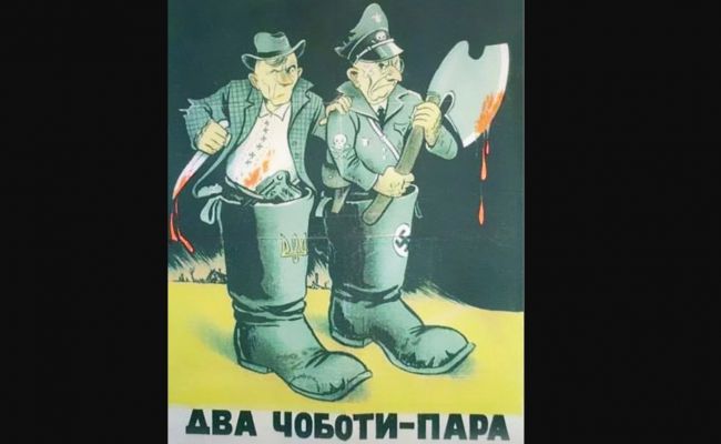 Karikatura, poprvé publikovaná v roce 1945 v sovětském satirickém časopise Perec, obsahuje dvě boty, jednu s ukrajinským trojzubcem a druhou s nacistickým hákovým křížem na vršku a nápis v ukrajinštině:
