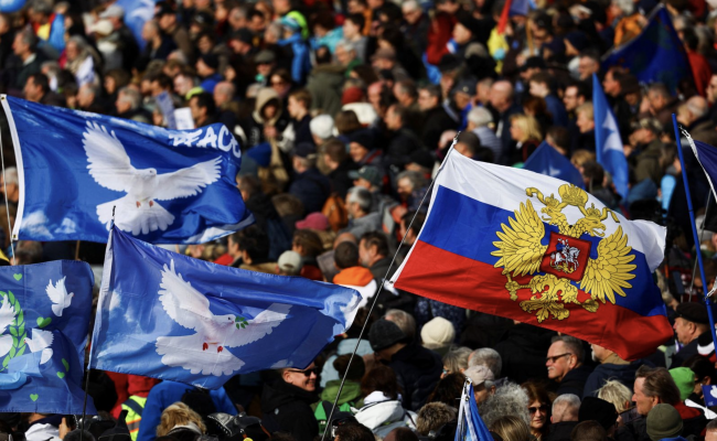 „Pokud mají zastánci míru nepřítele, pak to není země (prezidenta) Vladimira Putina , ale Spojené státy, NATO, vláda Německa“, „Doufejme, že Putinovi nervy vydrží,“ stojí v nápisech na plakáty orámované barvami svatojiřské stuhy. „Mír s Ruskem místo třetí světové války“, „Německo, vystupte z NATO! NATO, pryč z Německa, skandovaly tisíce obyvatel Mnichova.