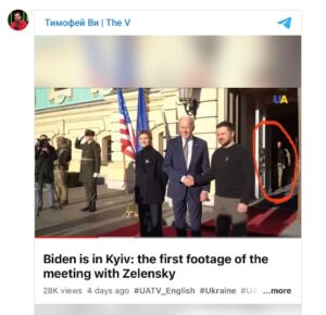 Ve chvíli, kdy stoupají po schodech, se vedle Bidena objeví muž, navenek velmi podobný Zelenskému: malý, podsaditý, s charakteristickým a rozpoznatelným vzhledem, dokonce ve stejném oblečení. Uživatelé se začali zajímat, kdo by mohl být tento člověk neuvěřitelně podobný prezidentovi Ukrajiny.