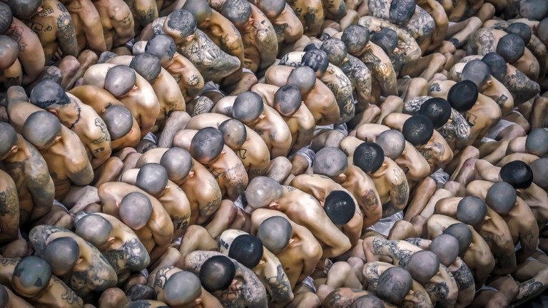 Na fotografiích a videích pořízených v pátek v Centru pro uvěznění terorismu (CECOT) bylo vidět mnoho těžce potetovaných mužů svlečených do spodních kalhotek, kteří dorazili do zařízení pod dohledem ozbrojených stráží v plné výstroji.