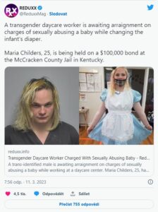 V americkém státě Kentucky byl zatčen 25letý biologický muž, který se identifikuje jako trans žena . Údajně měl sexuálně zneužít dítě jako zaměstnanec denního stacionáře. Případů zneužívání dětí takzvanými trans ženami v posledních letech znatelně přibývá.
