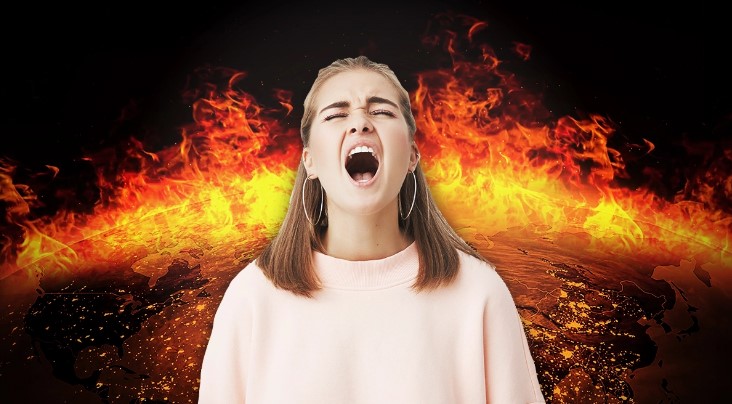 Úvodní obrázek symbolu klimatické paniky: pozadí přes freepik / poringdown, dívka přes freepik / cookie_studio