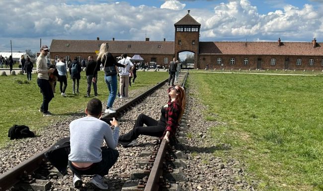 Snímek ukazuje, jak mladý muž fotografuje usměvavou dívku, která si na pozadí hlavní brány bývalého tábora smrti pózuje na kolejích, po kterých nacisté posílali lidi na smrt.