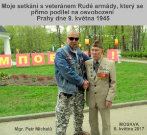 Pán, když to uslyšel, úplně nadšeně se dal se mnou do řeči a řekl mi, že osvobozoval Prahu, kam dorazil se svou jednotkou 9. května. Tak to zase spadla brada mě a nevěřícně jsem se zeptal – a kolik je Vám vlastně let? Odpověděla jeho paní, že mu je 93 let!! Neuvěřitelné! Velice vitální pán, velice pevný stisk ruky, hádal bych mu klidně i o 15, 20 let méně! Zapovídali jsme se… měl úžasnou paměť, vyprávěl o přechodu Labe v severních Čechách, pamatoval si nějaký most v Praze, po kterém překročil Vltavu… Věděl, znal a sám začal mluvit o té německé Schörnerově více jak milionové armádě, která stále tehdy byla v Praze a středních Čechách a chtěla se probojovat a prchnout do americké zóny… No opravdu velice, dojemné, zajímavé.