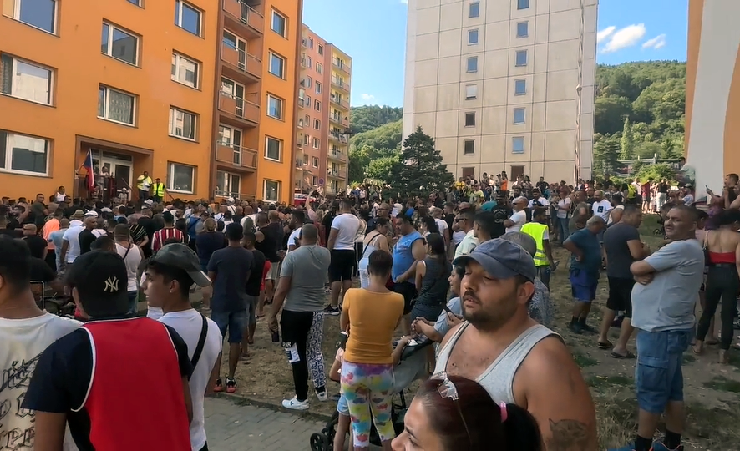 Na snímku protiukrajinská demonstrace Romů v Krupce