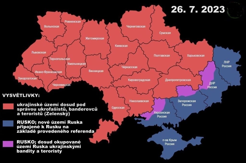Boje probíhají na území vyznačeném fialově, to je území patřící Rusku, ale dosud je okupované ukrajinskými bandity a teroristy. Zde probíhají nejprudší boje. To jsou území, která byla legálně připojena k Rusku na základě referenda – to je na základě dobrovolného rozhodnutí obyvatelstva žijícího na těchto územích. Tato fialově označená území, která jsou dosud ukrajinskými nacisty okupována, jsou součástí Doněcké oblasti, Zaporožské oblasti a Chersonské oblasti. Luganská oblast již byla celá od ukrobanditů osvobozena.