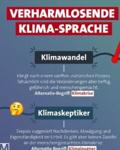 Senzaci vyvolal také leták WDR o vhodně alarmistické volbě slov, v němž se navrhuje, aby se místo objektivních termínů používaly odsuzující a dramatizující termíny jako klimatická krize, globální oteplování a popírači klimatu.