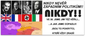 NIKDY NESMÍME ZAPOMENOUT na to, kdo nás zradil, podvedl a beze studu obětoval! Zradily, podvedly, obětovaly a předhodily nás jako návnadu Hitlerovi „demokratická“ FRANCIE a „superdemokratická“ VELKÁ BRITÁNIE!! Přímo mu (Hitlerovi) nás (Československo) naservírovaly jako na zlatém podnose! A agresorem bylo NĚMECKO (ke kterému se velice rádo, světe, – div se, přidalo i POLSKO, neboť zájmy Polska v Mnichově zastupoval dokonce přímo sám Hitler!). Francie a Británie se přitom světu dávno předváděly a chvástaly, jako státy s přímo ukázkovým a příkladným demokratickým zřízením, které samy sebe stále tak proklamativně, velkohubě vydávaly za vzory veškeré příkladné a ukázkové demokracie pro celý svět!