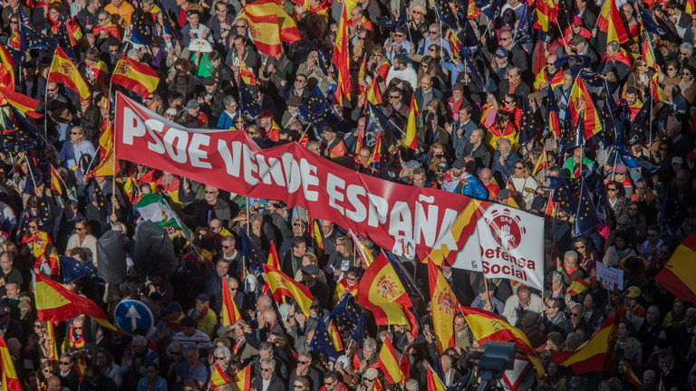 Sobotní demonstrace, největší v řetězci protestů od oznámení dohody před dvěma týdny, viděla demonstranty nesoucí transparenty s nápisy „oddělení pravomocí“, „zrádci“ a „ne mým jménem“. Zazněly skandování „Sanchez rezignovat“ a „Viva Espana“.