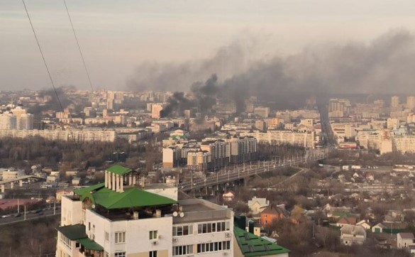 Několik ukrajinských střel zasáhlo obytnou část města. Záběry z oblasti potvrdily poškození několika budov a požár na ulicích.