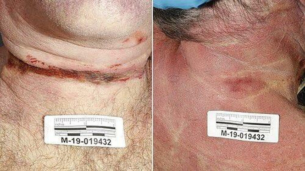 Pitevní fotografie ukazují, že ligatura na Jeffově krku je uprostřed jeho krku a jde přímo dozadu, jako by mu někdo dal kolem krku provaz a uškrtil ho, jako Carlo v autě ve filmu „Kmotr.“