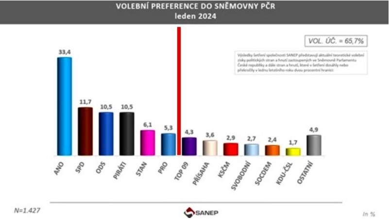Výše uvedený exkluzivní průzkum společnosti SANEP byl proveden metodou CAWI ve dnech 22. – 29. ledna 2024 na vybrané skupině v souhrnu 1.427 dotázaných, (obvykle jekteří představují reprezentativní vzorek obyvatel ČR ve věku 18+ let. Průzkum lednových volebních (nikoli stranických) preferencí vychází pouze z hlasů 65,7 % respondentů, kteří představují vzorek rozhodnutých voličů. Statistická chyba u uvedené skupiny obyvatel se pohybuje v rozmezí +-1,5%. Kontrola daného vzorku byla provedena triangulační datovou metodou.