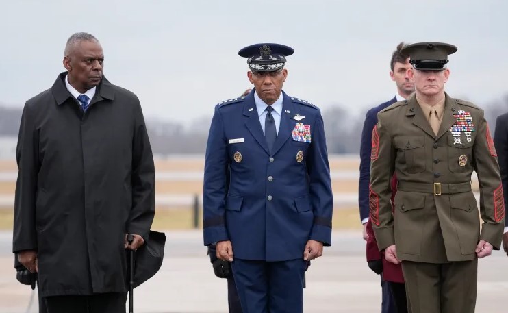 Úvodní fotografie: Američtí vojenští šéfové sledují, jak se rakve obsahující ostatky tří vojáků zabitých v Jordánsku vracejí na leteckou základnu Dover, Delaware, 2. února 2024 [Alex Brandon/AP Photo]