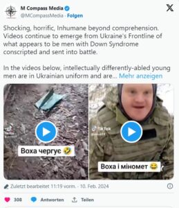 Objevuje se stále více obrázků mužů s Downovým syndromem, kteří jsou posíláni z Ukrajiny na frontu a ukrajinští vojáci s nimi špatně zacházejí.