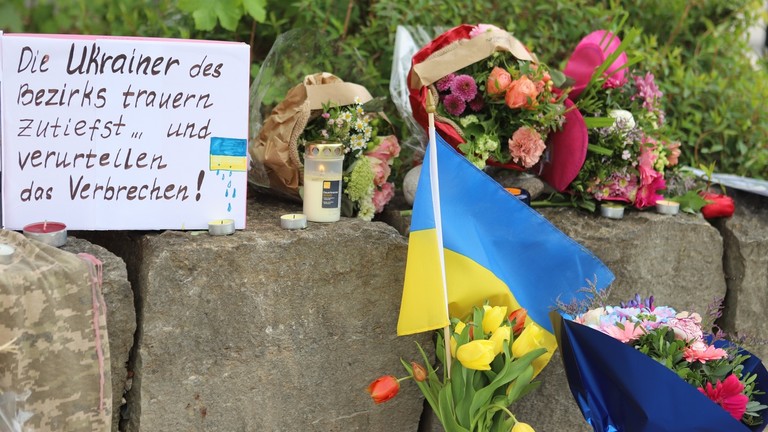 Úvodní fotografie: Vzkaz, ukrajinská vlajka a květiny zanechané v nákupním centru poblíž zločinu, Murnau, Bavorsko, Německo, 28. dubna 2024 ©  Getty Images / Constanze Wilz / aliance obrázků prostřednictvím Getty Images