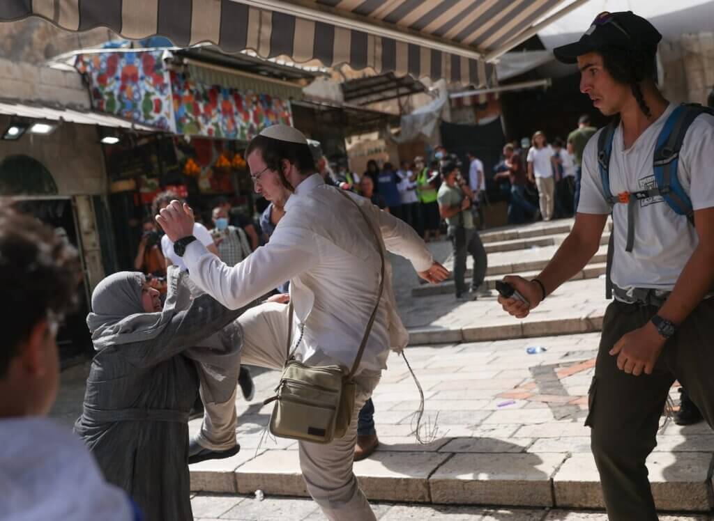 Úvodní fotografie: IZRAELSKÝ OSADNÍK ZAÚTOČIL NA PALESTINSKOU ŽENU V JERUZALÉMSKÉM STARÉM MĚSTĚ BĚHEM POCHODU S VLAJKOU „DEN JERUZALÉMA“, 29. KVĚTNA 2022. POCHOD VLAJKY JE KAŽDOROČNÍ PŘEHLÍDKOU PRAVICOVÉHO IZRAELSKÉHO NACIONALISMU A ANTIPALESTINSKÉHO RASISMU, KTERÁ MÁ OSLAVIT OBSAZENÍ VÝCHODU SIONISTICKÝMI SILAMI. JERUZALÉM V ROCE 1967. (FOTO: OHAD ZWEIGENBERG/SOCIÁLNÍ MÉDIA)