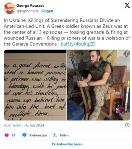 Podle zprávy byl řecký voják jménem Zeus v centru několika incidentů, při kterých byli zabiti ruští zajatci nebo ti, kteří se pokoušeli vzdát.