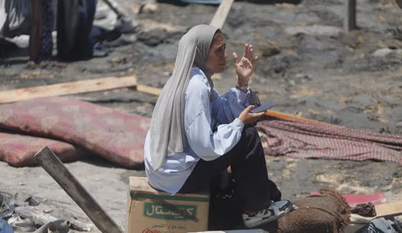 Úvodní fotografie: Žena sedí uprostřed ničení způsobeného izraelským náletem, který zabil nejméně 90 Palestinců v určené humanitární zóně v Khan Younis. Fotografie: Habboub Ramez/ABACA/REX/Shutterstock