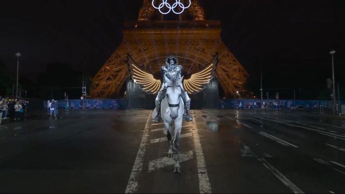V záznamu přenosu stanice Eurosport [3], která záznam ceremoniálu z YouTube ještě nesmazala, jsem analyzoval úsek jezdce, který nejprve jakoby cválá na mechanickém animovaném koni po hladině Seiny, ale potom scénická kamera provede střih na Elysejská pole pod Eiffelovou věží, z pod které právě vyjíždí tento jezdec, ale tentokrát už na živém koni.