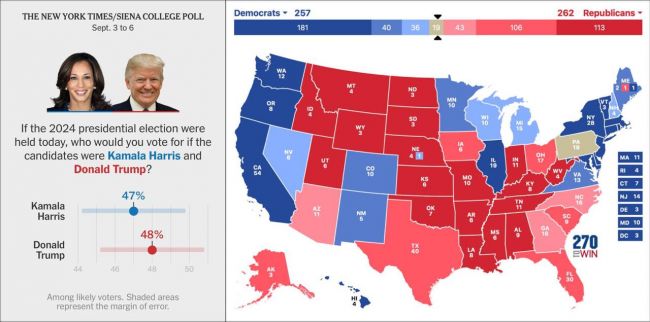 Trump vede nad Harrisem o 1 bod na celostátní úrovni v průzkumu New York Times. V členění podle států vede Trump v Arizoně, Georgii a Severní Karolíně. Harris má úzké vedení v Michiganu, Wisconsinu a Nevadě. Vše záleží na Pensylvánii, která může rozhodnout o výsledku voleb, upozorňuje odborník.