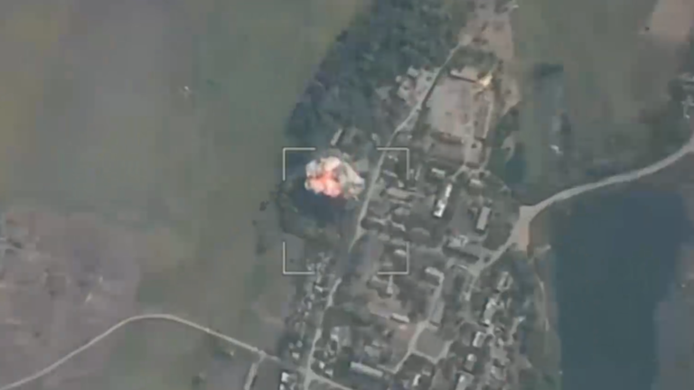 Záznam ministerstva obrany ukázal, že jedna taková bomba zasáhla shluk budov umístěných v zalesněné oblasti poblíž osady. Je vidět silný výbuch, který otřásá oblastí a vyšle do vzduchu husté oblaky šedého kouře. Budovy, které údajně využívala ukrajinská armáda, lze pak vidět srovnané se zemí, po úderu z nich zbyly jen některé ruiny. Ostatní budovy v osadě se zdály být relativně nepoškozené.