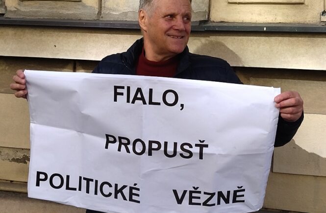 My jsme po proběhlém soudu postáli před soudní budovou s transparentem „FIALO, PROPUSŤ POLITICKÉ VĚZNĚ“ a s tímto transparentem jsme také pochodovali od sochy Svatého Václava dne 9. 10. 2024 na Klárov.