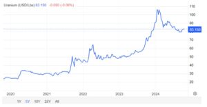 Rostoucí poptávka po jaderné energii se pravděpodobně ještě nějakou dobu odrazí v cenách uranu, protože smlouvy o dodávkách se uzavírají na delší období dopředu. Pozitivní výhled pro tuto komoditu předpovídá i Bank of America, podle níž by ceny mohly růst spolu s vyššími deficity v příštích třech letech. [1] Podle údajů světového dodavatele uranového paliva, společnosti Cameco, činila spotová cena uranu k 16. říjnu 2024 82 USD a jeho dlouhodobá cena 81,50 USD. Cena futures kontraktů obchodovaných na newyorské komoditní burze ve stejný den činila 83,150 dolaru za libru. *