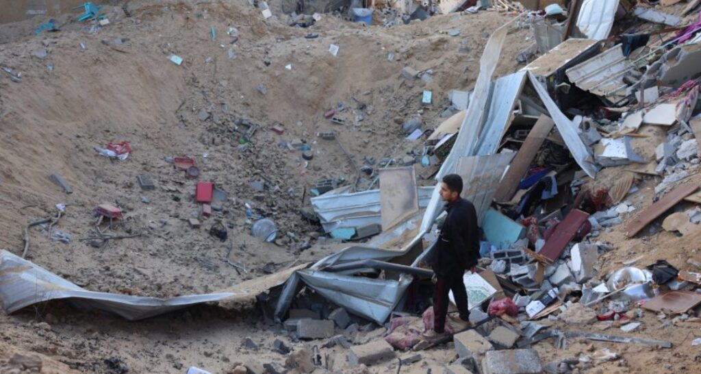 Úvodní fotografie: Lidé kontrolují škody na místě izraelského úderu, který se zaměřoval na bezpečnou zónu v Khan Younis, 25. října 2024. (Foto: Omar Ashtawy/APA Images)