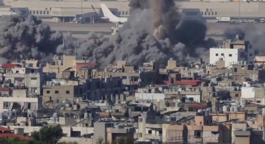 Záběry zaznamenané arabským reportérem ukazují, jak izraelská bomba srovnává se zemí budovu jen desítky metrů od ranveje