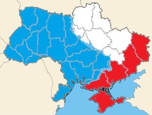 Všechny těžké zbraně by musely být staženy na západ jako součást masivní demilitarizované zóny (DMZ), přičemž existuje také možnost, že tento region „Podněpru“ by také mohl získat politickou autonomii nebo alespoň kulturní autonomii na ochranu práv etnických Rusů a dalších. kteří mluví tímto jazykem. Tento scénář zde byl poprvé předložen v březnu a mohl by mít níže uvedenou podobu, přičemž západní část země v modré barvě by mohla hostit jednotky NATO jako součást uspořádání, které bude následně popsáno: