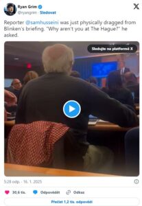 Nezávislý novinář Sam Husseini byl odvlečen z poslední tiskové konference amerického ministra zahraničí Antonyho Blinkena poté, co se pokusil položit otázku ohledně příměří v Gaze. Blinken tvrdil, že v posledních čtyřech letech byla úspěšná diplomacie, včetně příměří, i když Izrael i Hamás připisovaly zásluhy za dohodu nově zvolenému prezidentovi Donaldu Trumpovi.