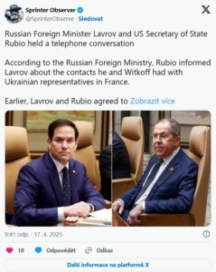 A to pořád není všechno. Před pár okamžiky ruská média přinesla zlomovou zprávu, že Marco Rubio telefonicky hovořil se Sergejem Lavrovem a informoval ho o tom, co se ve čtvrtek probíralo na schůzce evropských válečných jestřábů v Paříži, kam přijel nejen Marco Rubio, ale i Trumpův osobní a věrný přítel a současně vyjednavač Steve Witkoff.
