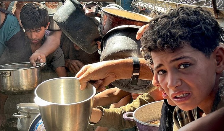Úvodní fotografie: Palestinci čekají v dlouhých frontách na nádoby s jídlem distribuované charitativními organizacemi, protože čelí potravinové krizi, v oblasti Al-Mawasi v Chán Júnis v pásmu Gazy 25. května 2025. (Foto: Moaz Abu Taha/APA Images)