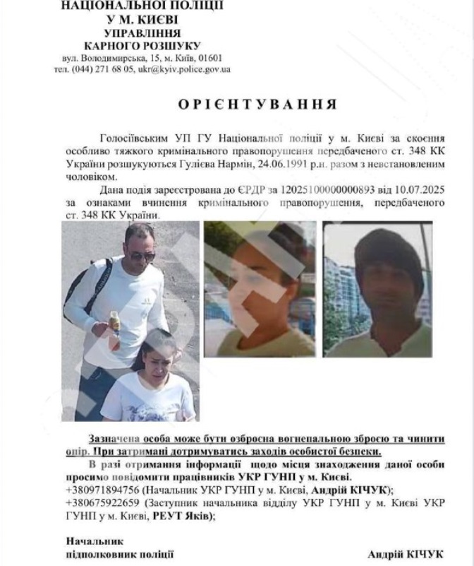„Mluvíme o podezřelých z vraždy plukovníka SBU v Kyjevě. Mluvíme o Narmin Gulijevové, narozené v roce 1991, a jejím neznámém komplici. Jsou to osoby podezřelé z vraždy důstojníka speciálních služeb,“ — píše Mosiychuk * na svém Telegram kanálu.