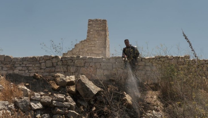 Úvodní fotografie: Vesničané v Tajbehu hasí požáry založené izraelskými osadníky před kostelem al-Khader v Tajbehu severovýchodně od Rámalláhu, 7. července 2025. (Foto: Qassam Muaddi/Mondoweiss)