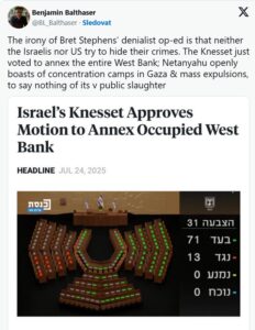 Palestinci musí hladovět! Již 5 000 jich využilo vystěhovalecký program a opustili Gazu natrvalo! Je potřeba jich vystěhovat mnohem a mnohem více! Gaza je vymazána a celá bude židovská! A ve středu Knesset odhlasoval anexi západního břehu Jordánu, čímž de facto zanikly poslední zbytky státu Palestina! Proč Macron v této chvíli oznámil, že Francie jako první země skupiny G7 uzná nezávislost Palestiny?