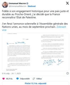 V překvapivém prohlášení na X ve čtvrtek Macron uvedl, že v tomto smyslu učiní formální prohlášení na Valném shromáždění OSN v září v New Yorku. “Dnes je naléhavě nutné ukončit válku v Gaze a zachránit civilní obyvatelstvo,” dodal.