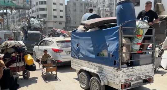 Zatímco mluvil, lidé se snažili nacpat tenké matrace a své nemnoho věcí na pár aut, rikš a povozů tažených osly v oblasti. Většina lidí se hrnula pěšky a nesla s sebou jen igelitové tašky. Více než 90 % obyvatel Gazy bylo od začátku války vysídleno, většina z nich opakovaně.
