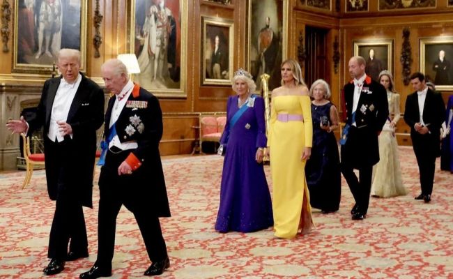 Důkazem toho jsou záběry z akce zveřejněné stanicí Sky News . Recepce se konala na počest oficiální návštěvy Trumpa a jeho manželky ve Spojeném království.