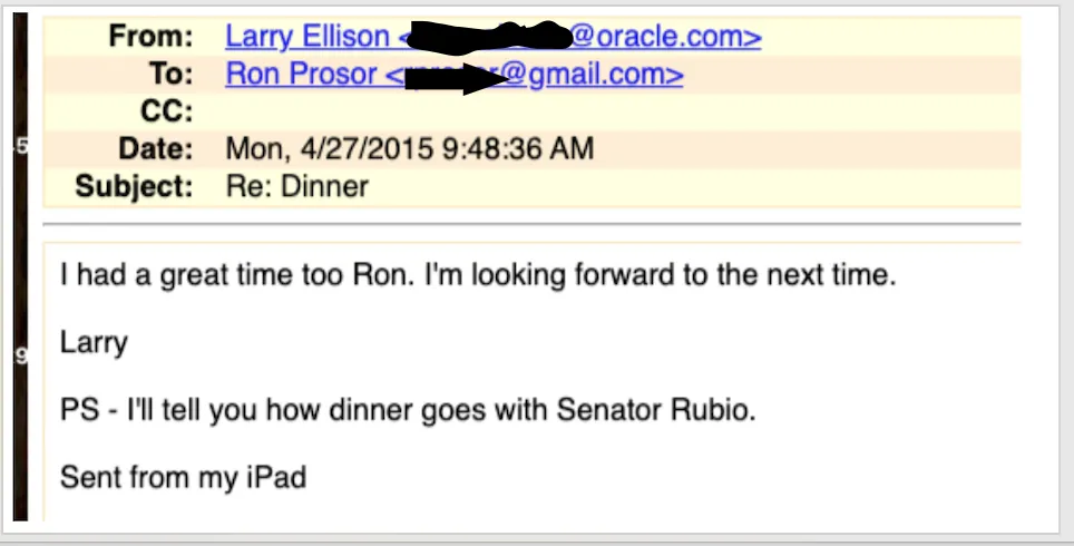 Dne 26. dubna 2015 poslal Prosor Ellisonovi e-mail s předmětem „Rubiův projev“ a požádal o kopii Rubiova projevu. (Pravděpodobně se jednalo o Rubiovo zahájení kampaně o týden dříve, v němž kritizoval Obamovo „nepřátelství vůči Izraeli“.) Následující den si oba vyměnili zprávy, že spolu povečeřeli a že se Ellison brzy s Rubiem setká: „PS – Řeknu vám, jak proběhla večeře se senátorem Rubiem.“
