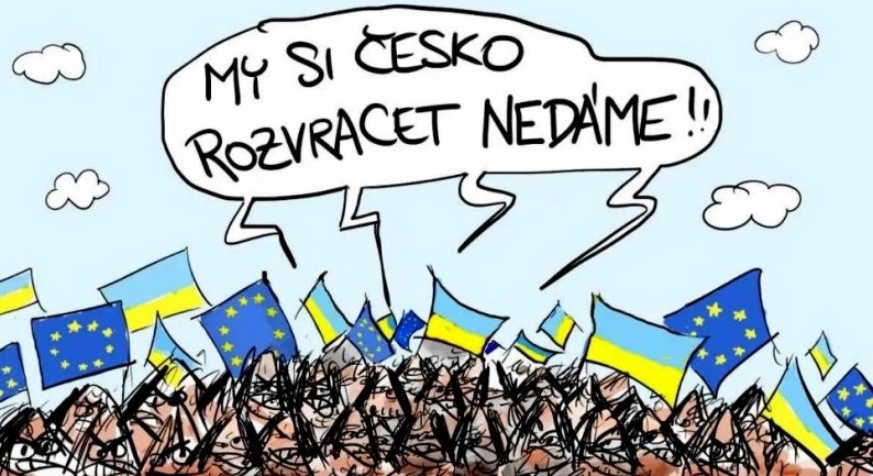 A takto vypadají hodiny výuky, jak správě probruselsky volit: on (Čech s českou vlajkou) volit půjde, hlásí ironicky Strachota – Člověk v tísni – politická neziskovka.