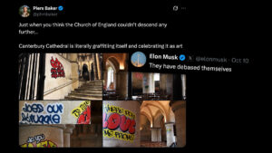 Pokles hodnot a znečištění jsou nyní uměním: alespoň si to myslí anglikánská církev. V Canterburské katedrále nyní graffiti zdobí sloupy...