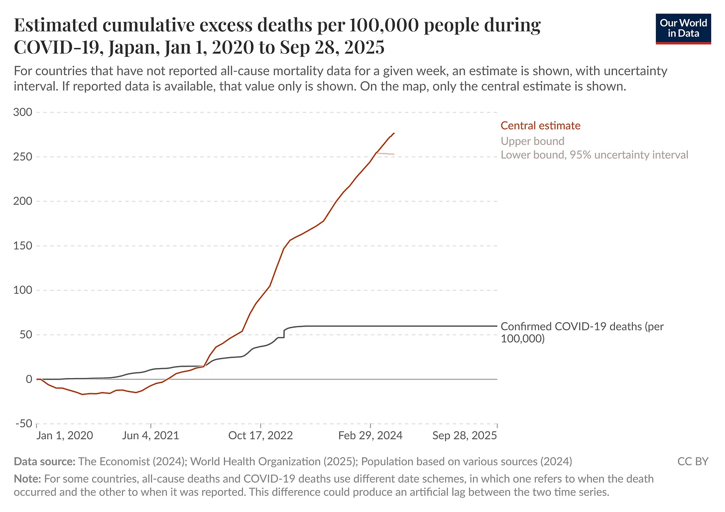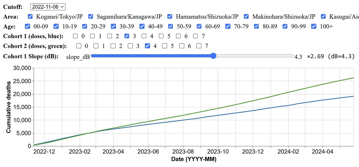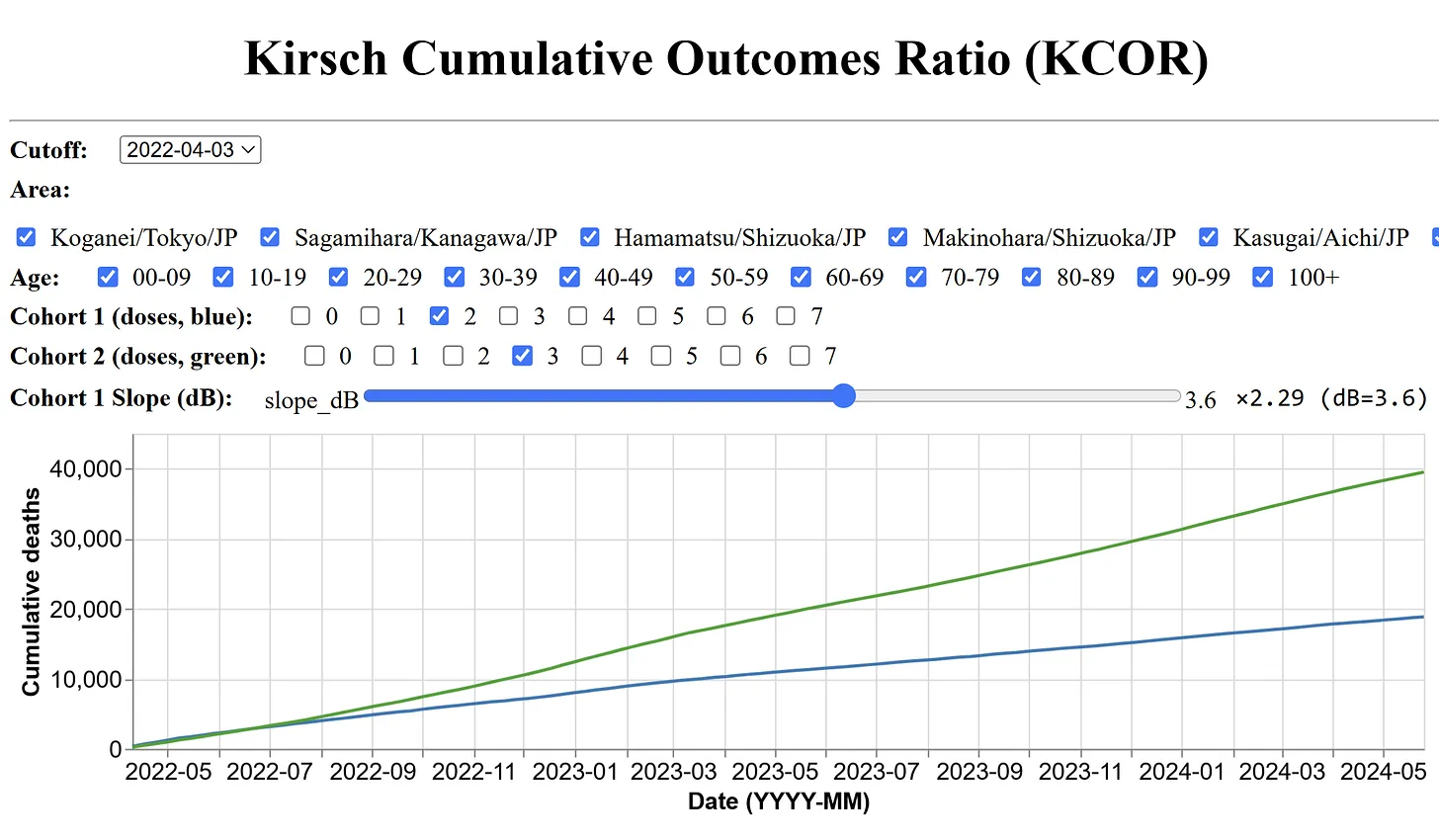 Japonský městský radní Kenji Fudžikawa vytvořil působivé webové stránky s nejnovějšími japonskými datovými soubory v rekordních objemech. Využívá standardizovanou epidemiologickou metodu CMRR (kumulativní poměr úmrtnosti) .